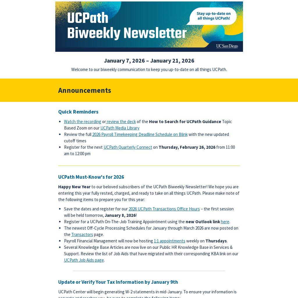 Happy New Year to our beloved subscribers of the UCPath Biweekly Newsletter! We hope you are entering this year fully rested, charged, and ready to take on all things UCPath. Please make note of the following items to prepare you for this year: