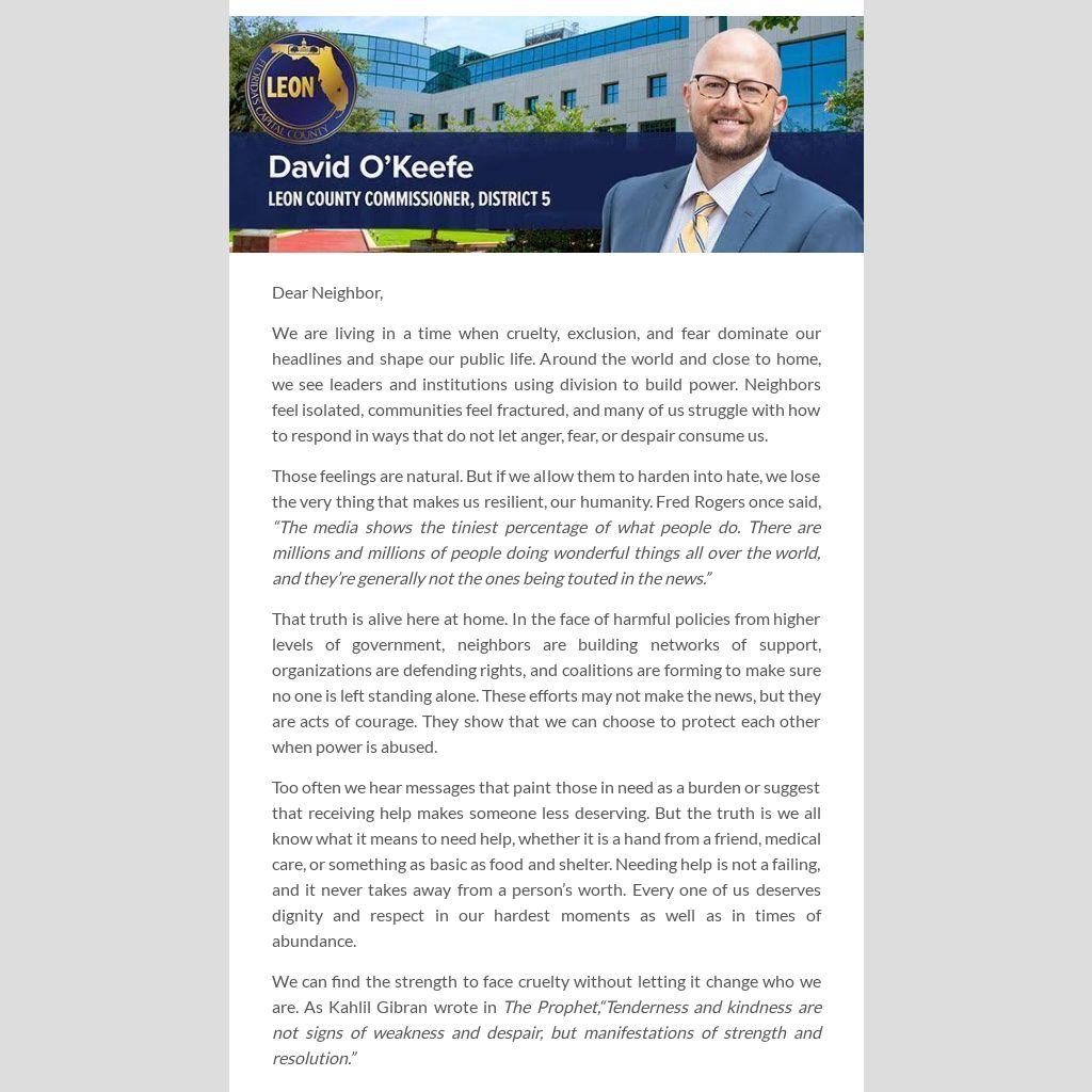 I may not get a vote in Congress or the state legislature, but here in Leon County I will be steadfast in using every tool we have to respond to cruelty, to minimize harm, and to protect the dignity of every member of our community. When policies from above create fear or exclusion, I will work to ensure our county responds with care and resolve.