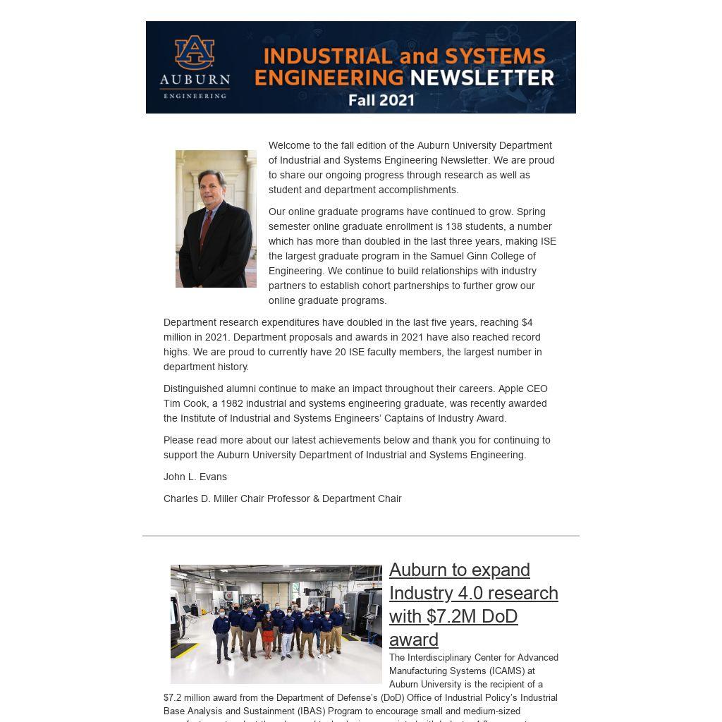 Welcome to the fall edition of the Auburn University Department of Industrial and Systems Engineering Newsletter. We are proud to share our ongoing progress through research as well as student and department accomplishments.