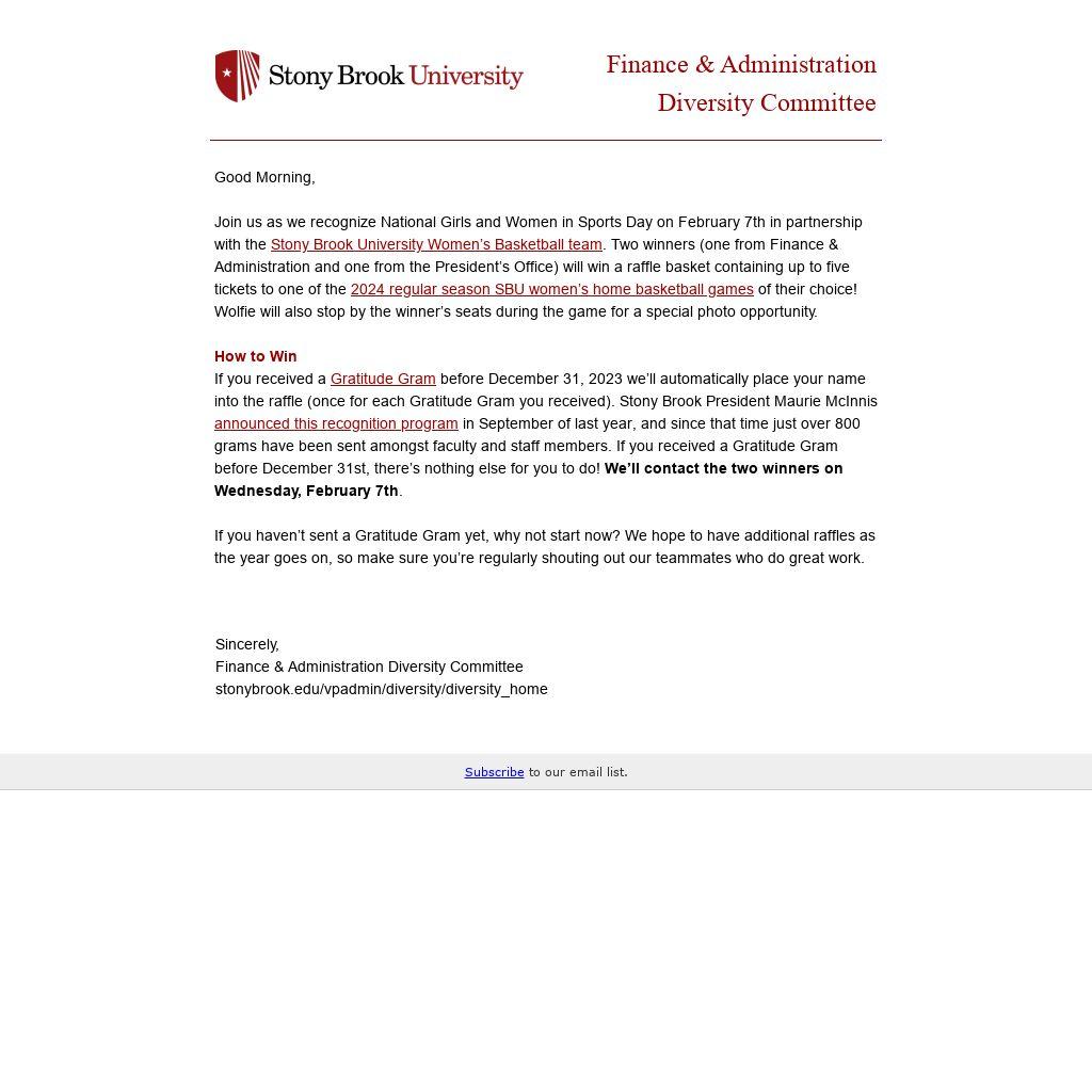 Join us as we recognize National Girls and Women in Sports Day on February 7th in partnership with the Stony Brook University Women’s Basketball team. Two winners (one from Finance & Administration and one from the President’s Office) will win a raffle basket containing up to five tickets to one of the 2024 regular season SBU women’s home basketball games of their choice! Wolfie will also stop by the winner’s seats during the game for a special photo opportunity.
