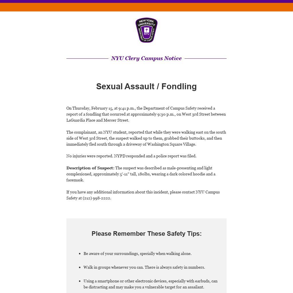 On Thursday, February 15, at 9:41 p.m., the Department of Campus Safety received a report of a fondling that occurred at approximately 9:30 p.m., on West 3rd Street between LaGuardia Place and Mercer Street.