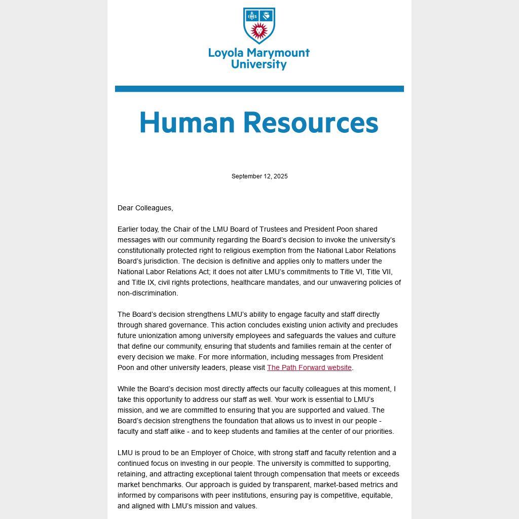Earlier today, the Chair of the LMU Board of Trustees and President Poon shared messages with our community regarding the Board’s decision to invoke the university’s constitutionally protected right to religious exemption from the National Labor Relations Board’s jurisdiction. The decision is definitive and applies only to matters under the National Labor Relations Act; it does not alter LMU’s commitments to Title VI, Title VII, and Title IX, civil rights protections, healthcare mandates, and our unwavering policies of non-discrimination.