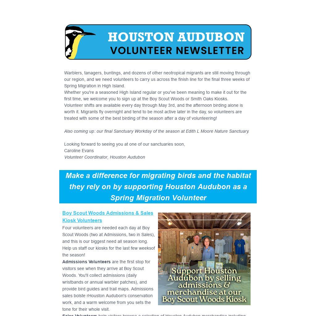 Warblers, tanagers, buntings, and dozens of other neotropical migrants are still moving through our region, and we need volunteers to carry us across the finish line for the final three weeks of Spring Migration in High Island.