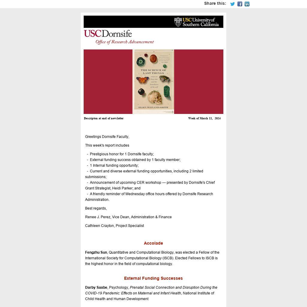 - Prestigious honor for 1 Dornsife faculty; - External funding success obtained by 1 faculty member; - 1 Internal funding opportunity; - Current and diverse external funding opportunities, including 2 limited submissions; - Announcement of upcoming CER workshop — presented by Dornsife's Chief Grant Strategist, Heidi Parker; and - A friendly reminder of Wednesday office hours offered by Dornsife Research Administration.