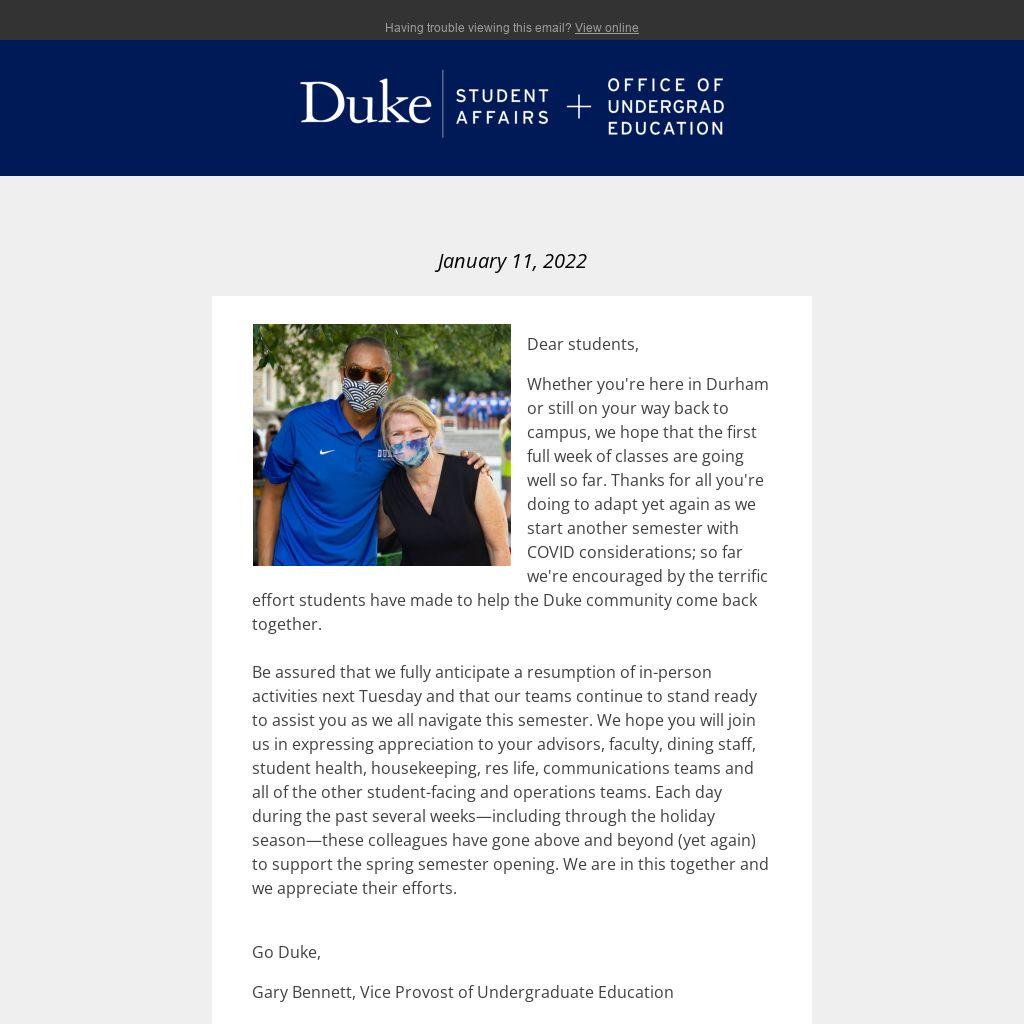 Whether you're here in Durham or still on your way back to campus, we hope that the first full week of classes are going well so far. Thanks for all you're doing to adapt yet again as we start another semester with COVID considerations; so far we're encouraged by the terrific effort students have made to help the Duke community come back together.