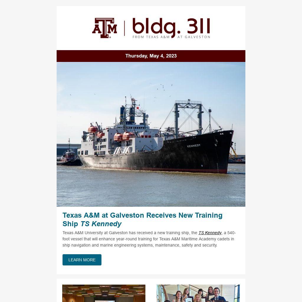 Texas A&M University at Galveston has received a new training ship, the TS Kennedy, a 540-foot vessel that will enhance year-round training for Texas A&M Maritime Academy cadets in ship navigation and marine engineering systems, maintenance, safety and security.
