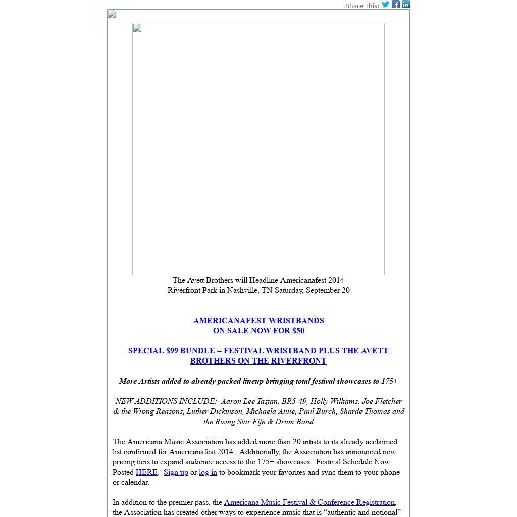 The Americana Music Association has added more than 20 artists to its already acclaimed list confirmed for Americanafest 2014. Additionally, the Association has announced new pricing tiers to expand audience access to the 175+ showcases. Festival Schedule Now Posted
