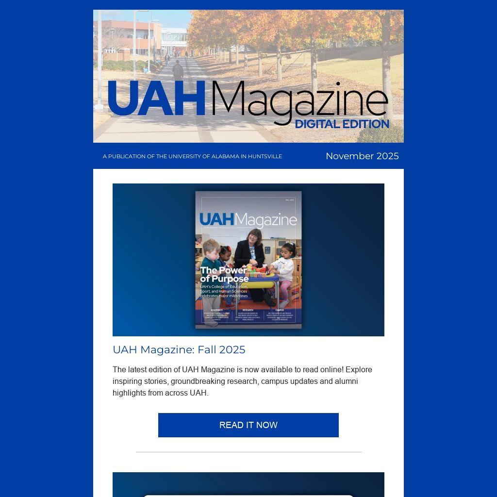 The latest edition of UAH Magazine is now available to read online! Explore inspiring stories, groundbreaking research, campus updates and alumni highlights from across UAH.