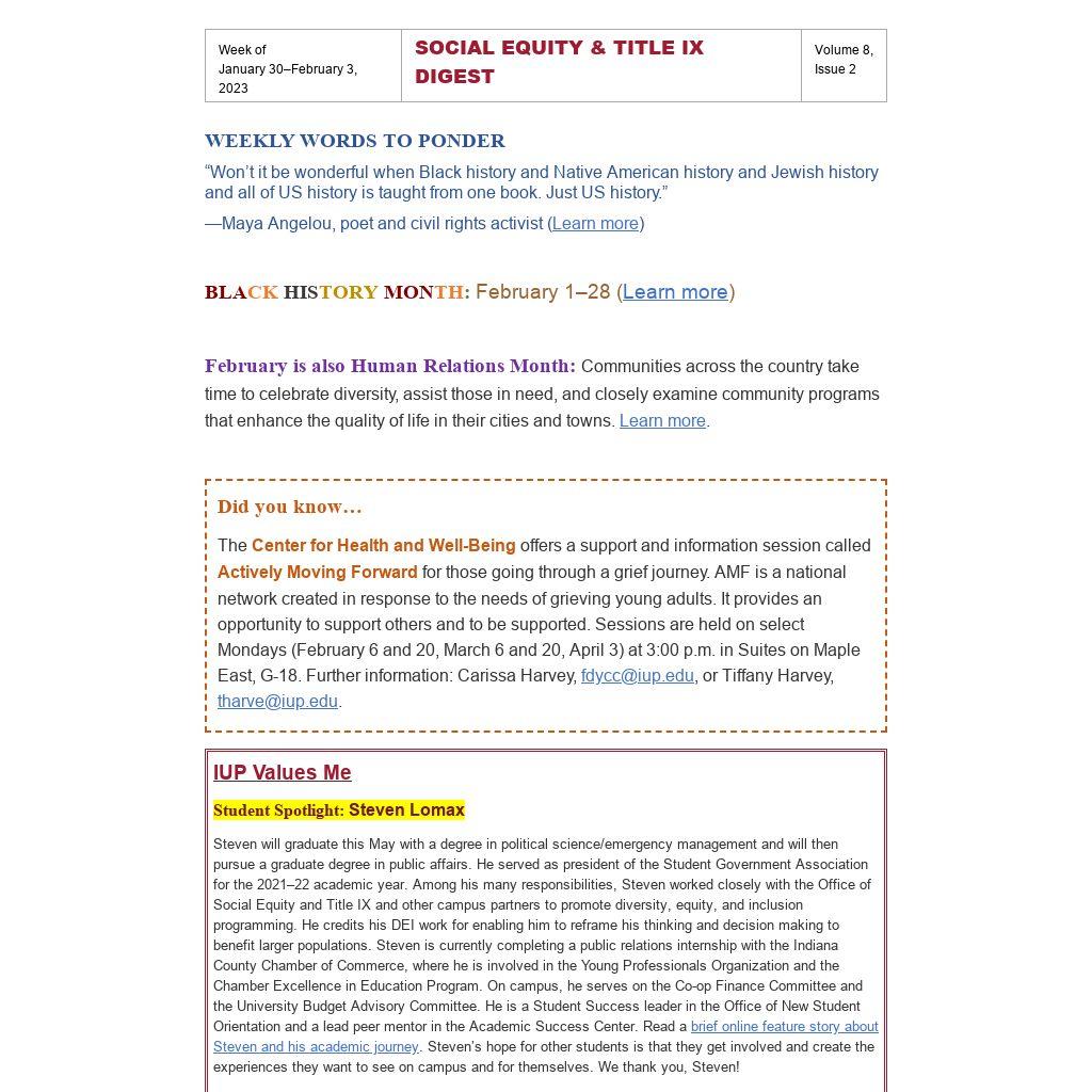 Digest issues are emailed every Monday morning. Send all information concerning your event to social-equity@iup.edu, and we will include it in the appropriate weekly issue. Also, please be sure to enter your event in the CMS on the DIVERSITY, STUDENT, and CENTRAL CALENDARS so that it will receive wider marketing, appear in IUP Now, and achieve greater attendance.
