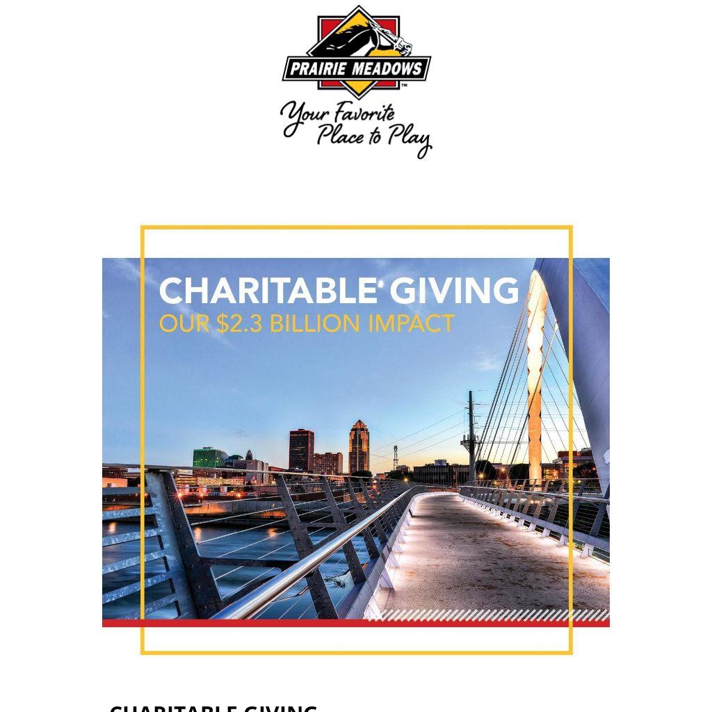 Prairie Meadows has provided more than $2.3 billion over the past 36 years through taxes and charitable donations to improve, strengthen, and enhance our community. We are dedicated to advancing meaningful projects and creating lasting change across Iowa. In 2024, $51.5 million was provided in charitable giving to promote economic development, agriculture, jobs, and tourism across Polk County.
