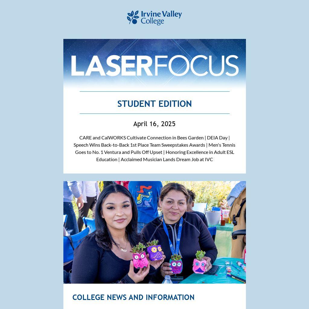 CARE and CalWORKS Cultivate Connection in Bees Garden | DEIA Day | Speech Wins Back-to-Back 1st Place Team Sweepstakes Awards | Men's Tennis Goes to No. 1 Ventura and Pulls Off Upset | Honoring Excellence in Adult ESL Education | Acclaimed Musician Lands Dream Job at IVC