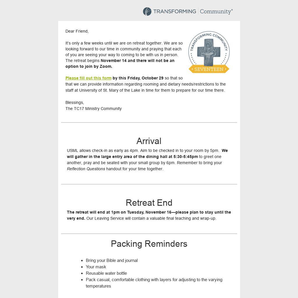 USML allows check-in as early as 4pm. Aim to be checked in to your room by 5pm. We will gather in the large entry area of the dining hall at 5:30-5:45pm to greet one another, pray and be seated with your small group by 6pm. Remember to bring your Reflection Questions handout for your time together.