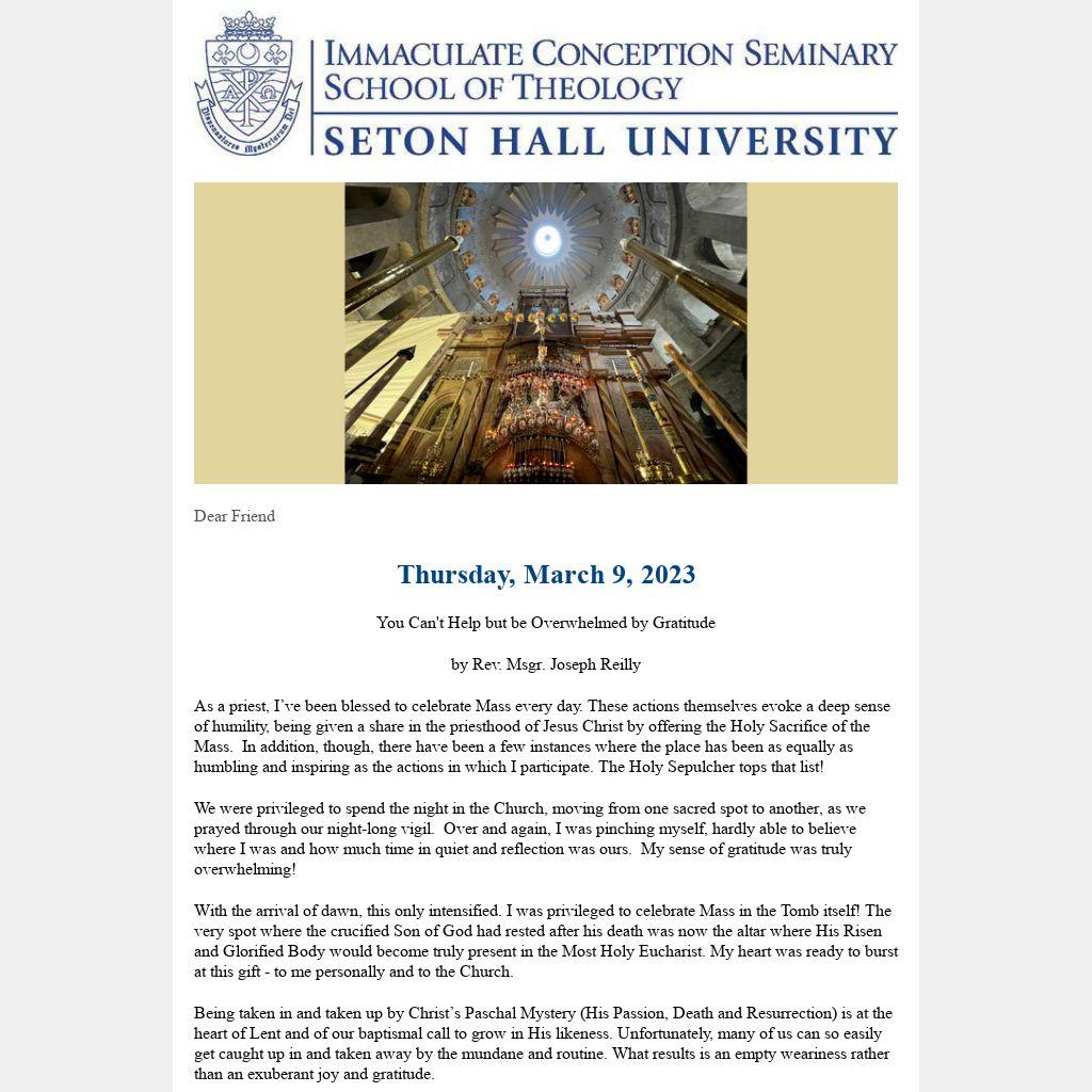 Rev. Msgr. Joseph Reilly, S.T.L., Ph.D., Rector/Dean Emeritus, Immaculate Conception Seminary School of Theology. He holds a Bachelor of Sacred Theology from Pontifical Gregorian University, Rome, a licentiate in Sacred Theology (STL) from Pontificio Istituto Teresianum, Rome, and a Ph.D. in Educational Administration from Fordham University. He has served as a member of the Archdiocesan Priest Personnel Board, the Advisory Committee on Continuing Education and Ongoing Formation of Priests, the Archdiocesan Vocations Board, and the Board of Trustees of Seton Hall University. Pope John Paul II named him a Chaplain to His Holiness in 2005, with the title of Reverend Monsignor. In 2016 during the Holy Year of Mercy, the Pontifical Council for Promoting New Evangelization sought priests who were living signs "of the Father's welcome to all those in search of His forgiveness." He was the only priest from the Archdiocese of Newark formally commissioned as a Missionary of Mercy by Pope Francis.