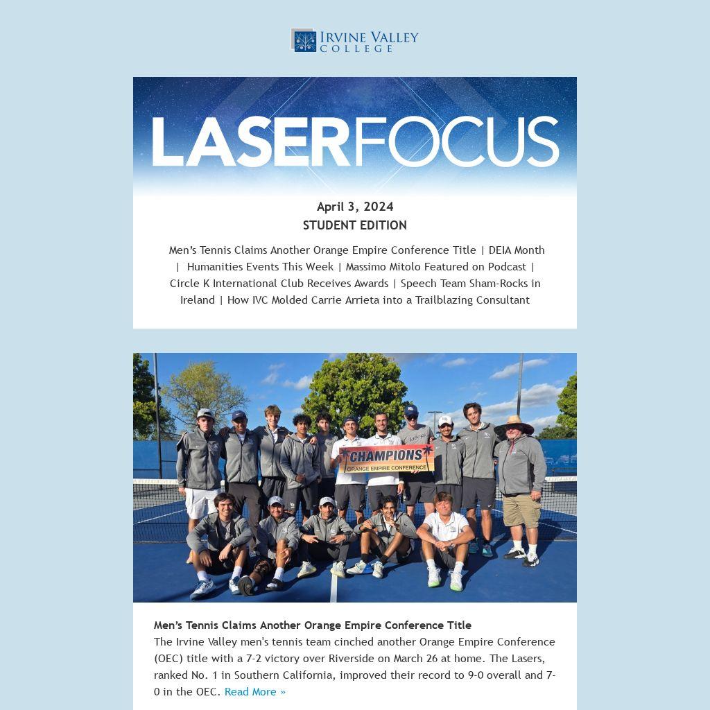 Men’s Tennis Claims Another Orange Empire Conference Title | DEIA Month | Humanities Events This Week | Massimo Mitolo Featured on Podcast | Circle K International Club Receives Awards | Speech Team Sham-Rocks in Ireland | How IVC Molded Carrie Arrieta into a Trailblazing Consultant
