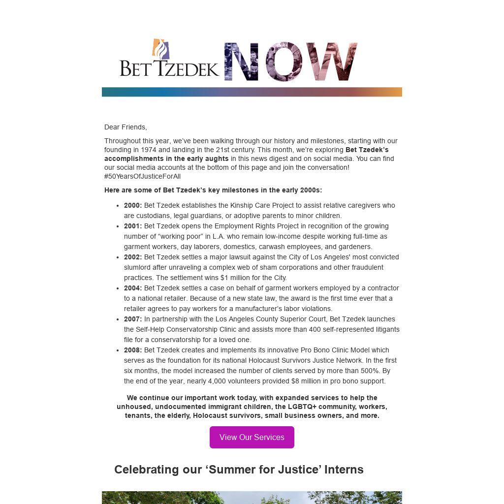 Throughout this year, we’ve been walking through our history and milestones, starting with our founding in 1974 and landing in the 21st century. This month, we’re exploring Bet Tzedek’s accomplishments in the early aughts in this news digest and on social media. You can find our social media accounts at the bottom of this page and join the conversation! #50YearsOfJusticeForAll