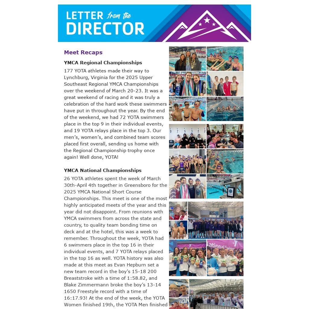 177 YOTA athletes made their way to Lynchburg, Virginia for the 2025 Upper Southeast Regional YMCA Championships over the weekend of March 20-23. It was a great weekend of racing and it was truly a celebration of the hard work these swimmers have put in throughout the year. By the end of the weekend, we had 72 YOTA swimmers place in the top 9 in their individual events, and 19 YOTA relays place in the top 3. Our men’s, women’s, and combined team scores placed first overall, sending us home with the Regional Championship trophy once again! Well done, YOTA!