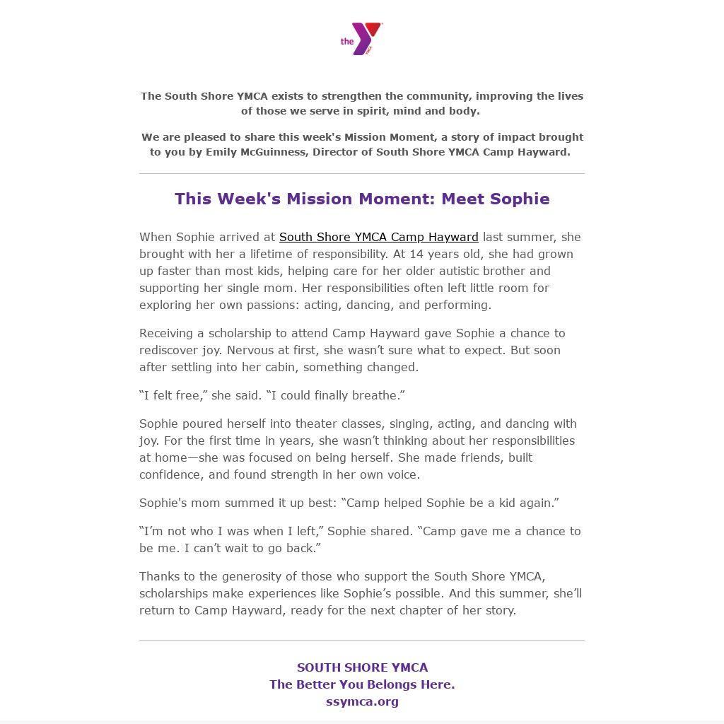 Thanks to the generosity of those who support the South Shore YMCA, scholarships make experiences like Sophie’s possible. And this summer, she’ll return to Camp Hayward, ready for the next chapter of her story.