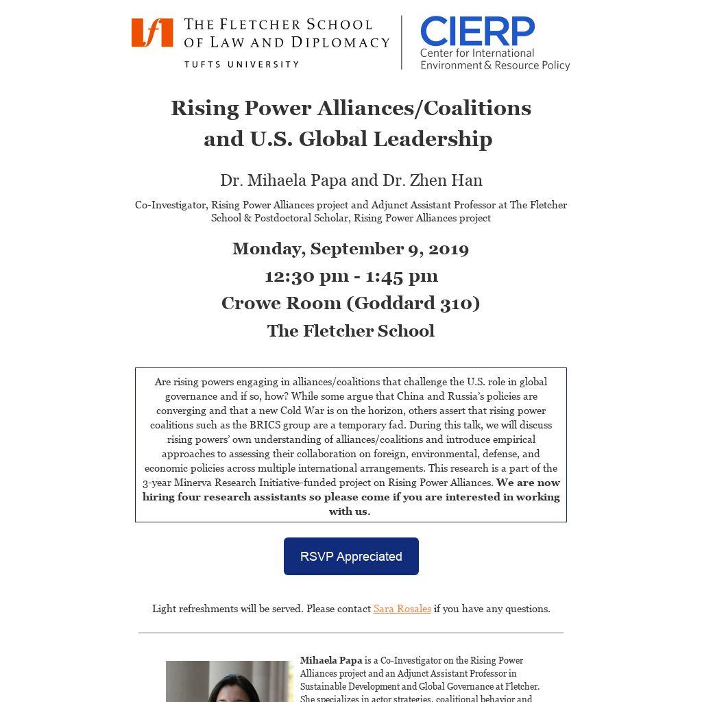 Mihaela Papa is a Co-Investigator on the Rising Power Alliances project and an Adjunct Assistant Professor in Sustainable Development and Global Governance at Fletcher. She specializes in actor strategies, coalitional behavior and complex negotiations, especially in the context of environmental regulation and rising power diplomacy. As a postdoctoral fellow at Harvard Law School, she examined India, China and Brazil in international dispute settlement, spent six months in China as a visiting researcher at Fudan’s Center for BRICS Studies and embarked on a BRICS-focused research agenda. Mihaela has published on rising powers and sustainable development diplomacy in Global Environmental Politics, Global Environmental Change, Chinese Journal of International Politics and many other journals. She is an active practitioner with a lot of experience advising institutions on global strategies and managing international collaborations. In this capacity she has worked at MIT and at the Croatian Ministry of Foreign Affairs, as well as consulted for the U.S. government, the European Commission, and the International Institute for Sustainable Development. Originally a trade economist, she completed her MALD and PhD at The Fletcher School, Tufts University.
