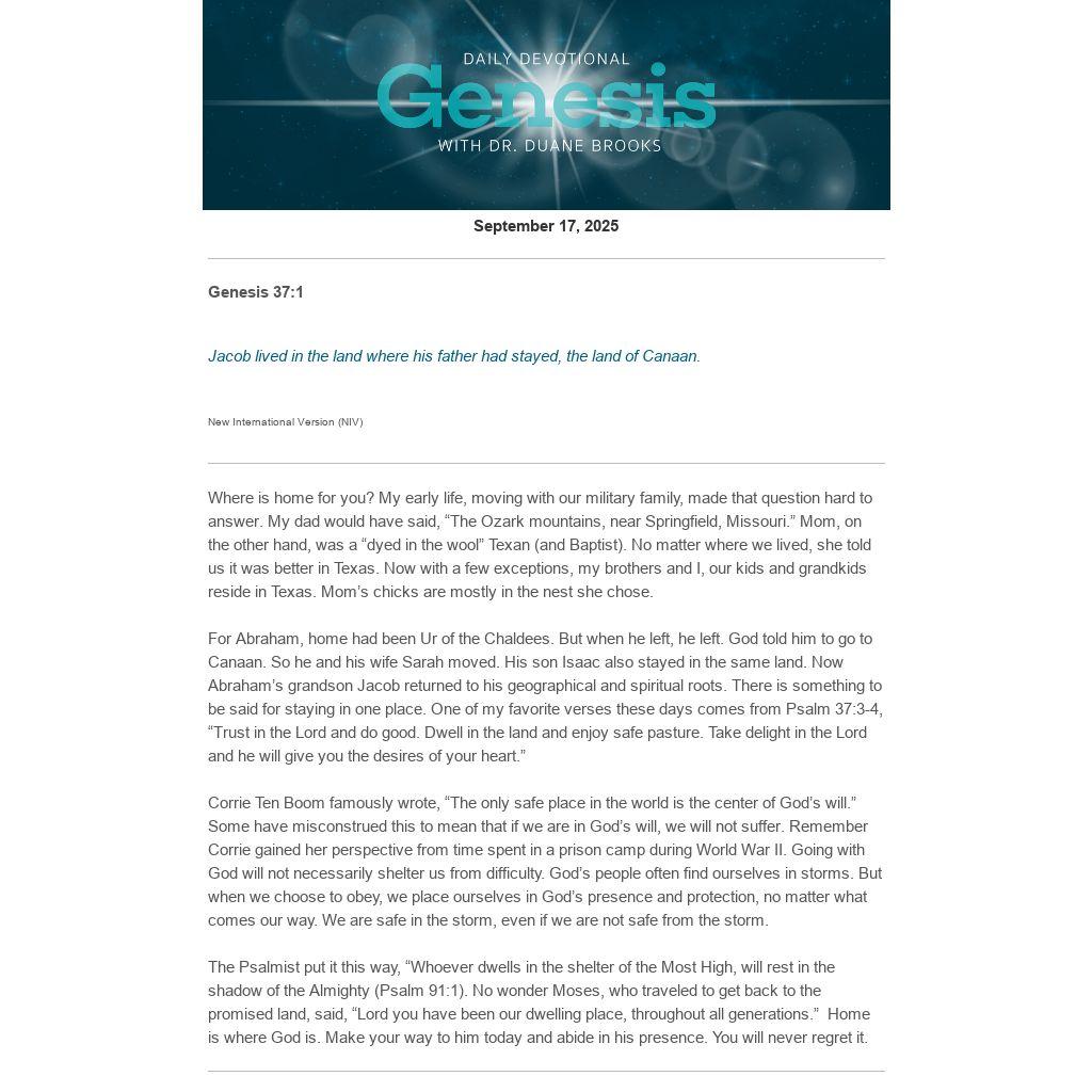 For Abraham, home had been Ur of the Chaldees. But when he left, he left. God told him to go to Canaan. So he and his wife Sarah moved. His son Isaac also stayed in the same land. Now Abraham’s grandson Jacob returned to his geographical and spiritual roots. There is something to be said for staying in one place. One of my favorite verses these days comes from Psalm 37:3-4, “Trust in the Lord and do good. Dwell in the land and enjoy safe pasture. Take delight in the Lord and he will give you the desires of your heart.”