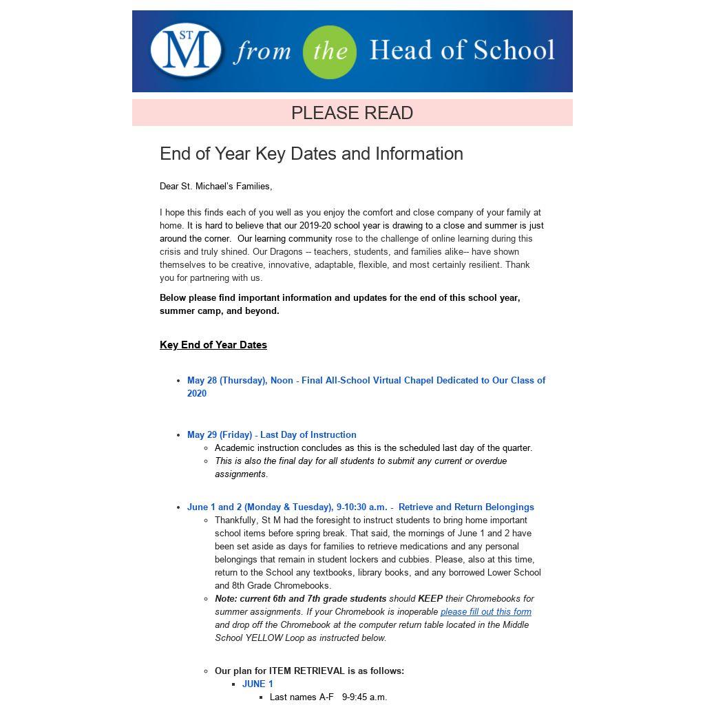 I hope this finds each of you well as you enjoy the comfort and close company of your family at home. It is hard to believe that our 2019-20 school year is drawing to a close and summer is just around the corner. Our learning community rose to the challenge of online learning during this crisis and truly shined. Our Dragons -- teachers, students, and families alike-- have shown themselves to be creative, innovative, adaptable, flexible, and most certainly resilient. Thank you for partnering with us.