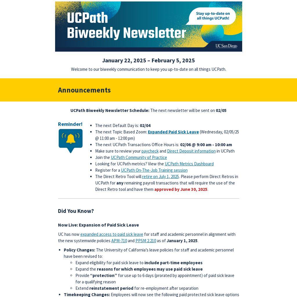 UCPath Biweekly Newsletter Schedule: The next newsletter will be sent on 02/05 |