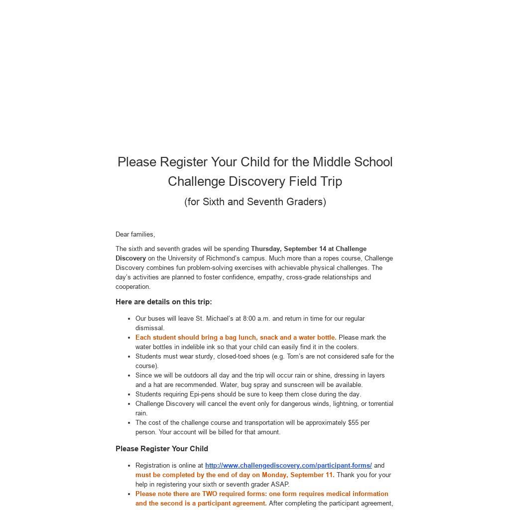 Please Register Your Child- Registration is online at http://www.challengediscovery.com/participant-forms/ and must be completed by the end of day on Monday, September 11. Thank you for your help in registering your sixth or seventh grader ASAP.