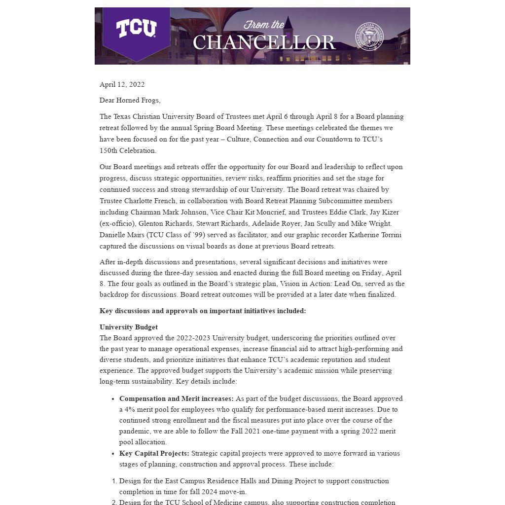 We remain exceptionally grateful for the leadership and expertise offered by our Board of Trustees, as well as their investment of time and resources in TCU’s success. The Board discussed several longstanding governance topics including Trustee expectations, duties and responsibilities. Trustee Kade L. Matthews was thanked for his active service and was elected to Emeritus status. No Honorary Trustees were named at this time.