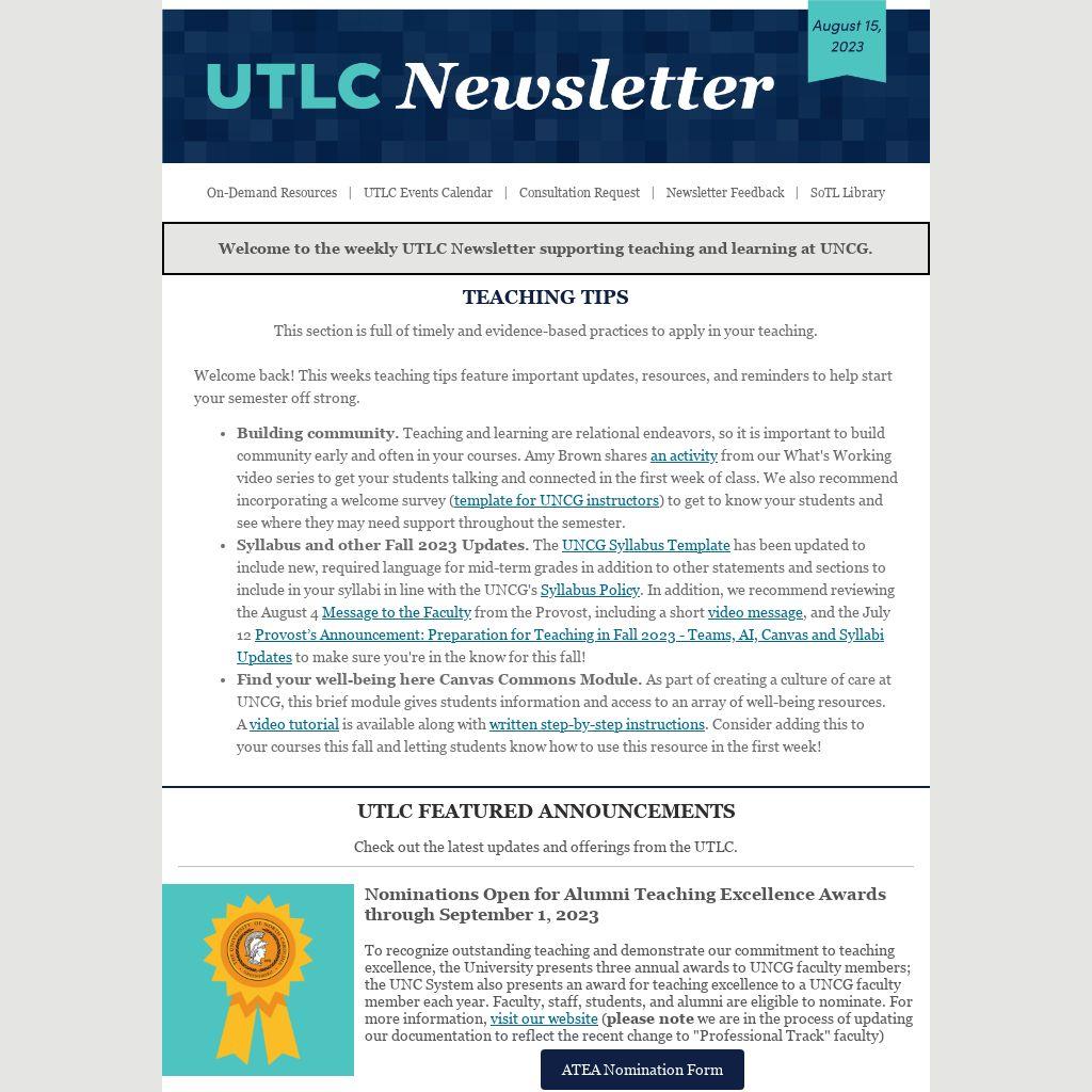 Welcome to the weekly UTLC Newsletter supporting teaching and learning at UNCG.