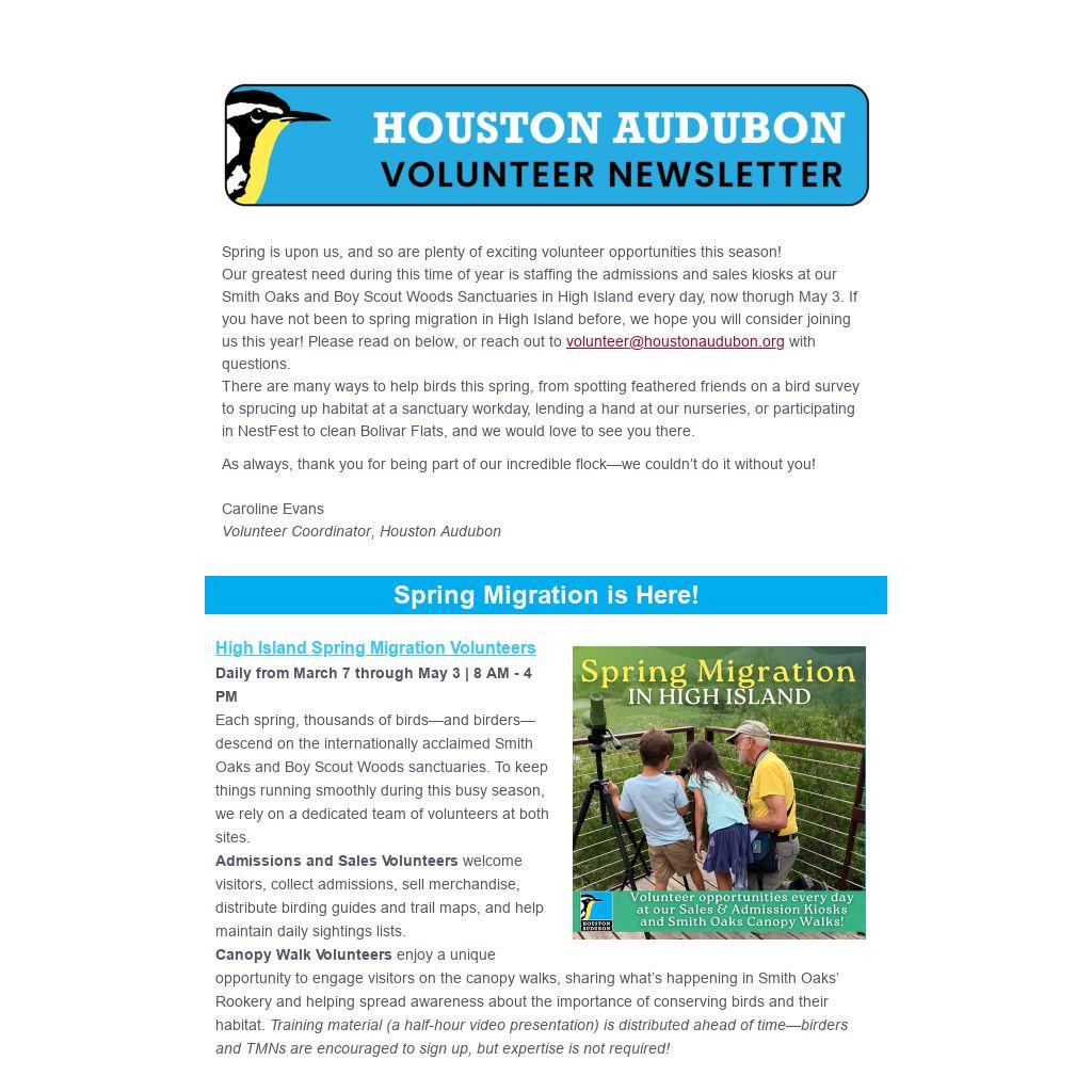 Spring is upon us, and so are plenty of exciting volunteer opportunities this season! Our greatest need during this time of year is staffing the admissions and sales kiosks at our Smith Oaks and Boy Scout Woods Sanctuaries in High Island every day, now thorugh May 3. If you have not been to spring migration in High Island before, we hope you will consider joining us this year! Please read on below, or reach out to volunteer@houstonaudubon.org with questions. There are many ways to help birds this spring, from spotting feathered friends on a bird survey to sprucing up habitat at a sanctuary workday, lending a hand at our nurseries, or participating in NestFest to clean Bolivar Flats, and we would love to see you there.