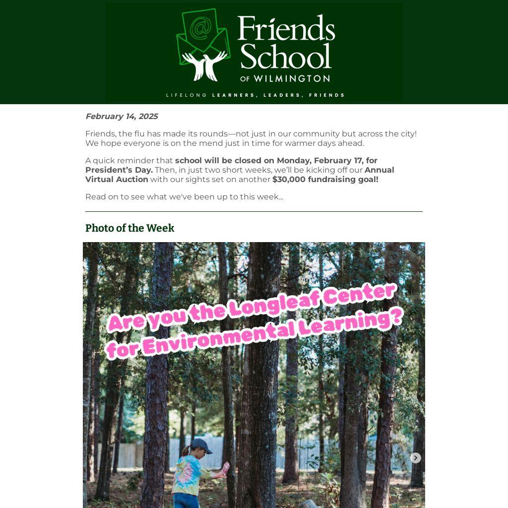 A quick reminder that school will be closed on Monday, February 17, for President’s Day. Then, in just two short weeks, we’ll be kicking off our Annual Virtual Auction with our sights set on another $30,000 fundraising goal!