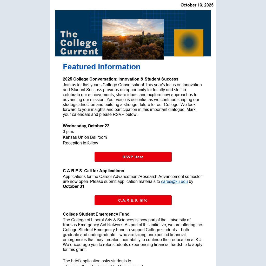 The College of Liberal Arts & Sciences is now part of the University of Kansas Emergency Aid Network. As part of this initiative, we are offering the College Student Emergency Fund to support College students—both graduate and undergraduate—who are facing unexpected financial emergencies that may threaten their ability to continue their education at KU. We encourage you to refer students experiencing financial hardship to apply for this grant.