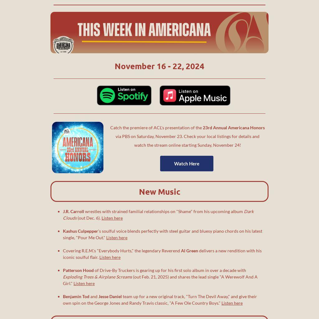 Catch the premiere of ACL's presentation of the 23rd Annual Americana Honors via PBS on Saturday, November 23. Check your local listings for details and watch the stream online starting Sunday, November 24!