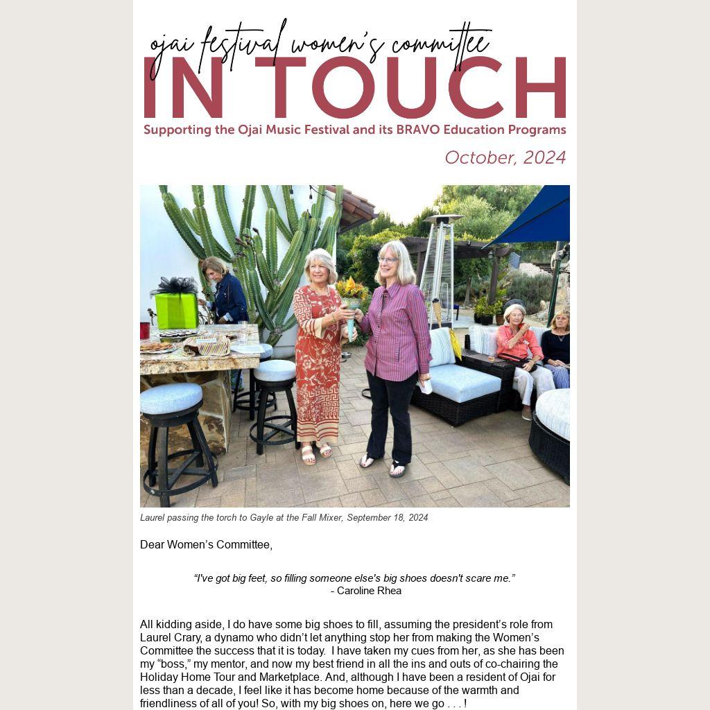 All kidding aside, I do have some big shoes to fill, assuming the president’s role from Laurel Crary, a dynamo who didn’t let anything stop her from making the Women’s Committee the success that it is today. I have taken my cues from her, as she has been my “boss,” my mentor, and now my best friend in all the ins and outs of co-chairing the Holiday Home Tour and Marketplace. And, although I have been a resident of Ojai for less than a decade, I feel like it has become home because of the warmth and friendliness of all of you! So, with my big shoes on, here we go . . . !