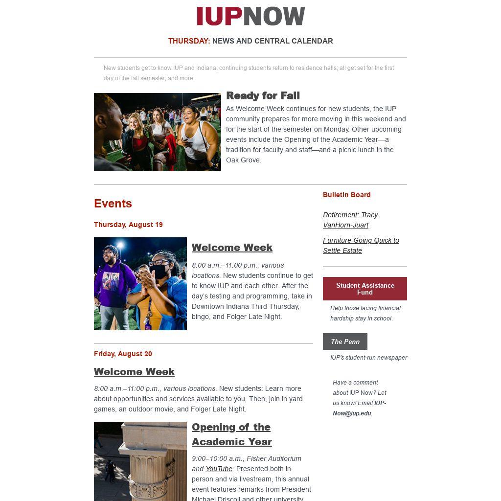 Distributed to IUP employees and students three days a week on its summer schedule, IUP Now is the official newsletter of Indiana University of Pennsylvania. It features news from across the IUP website, compiled by the Division of Marketing and Communications. Find out how to get your news and events in IUP Now.