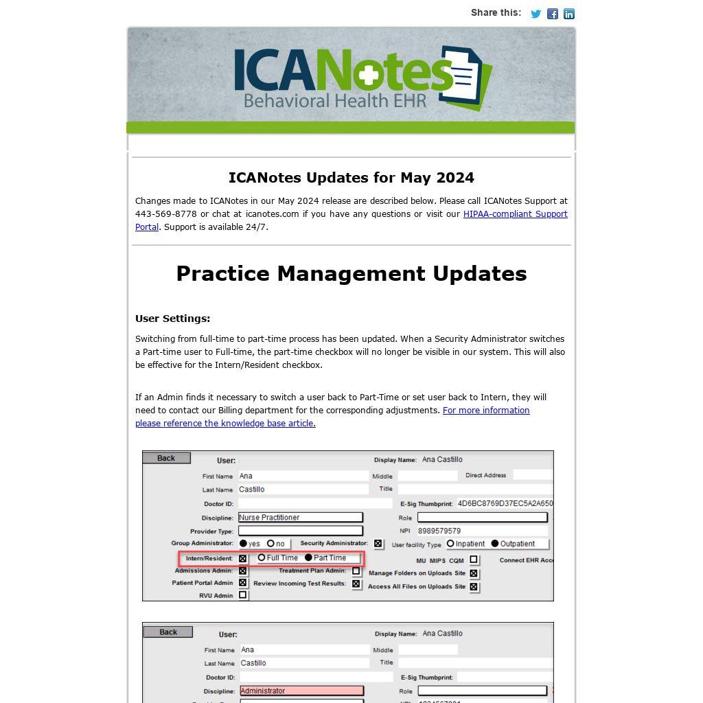 Changes made to ICANotes in our May 2024 release are described below. Please call ICANotes Support at 443-569-8778 or chat at icanotes.com if you have any questions or visit our HIPAA-compliant Support Portal. Support is available 24/7.