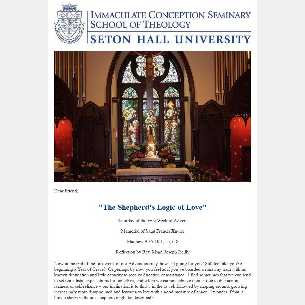 The image for today’s reflection is from the Seminary Chapel of Christ the Good Shepherd. The beautiful image is directly behind the crucifix, the altar and the tabernacle. It reminds me each time I see it that my manner of loving needs to be like that of Christ. I am grateful for this time in Advent, as it affords me – and you – the opportunity look at the way I love. What is my “logic of love?” When I see the suffering of others, is my heart moved? Do I consider myself as living a life of zeal for the Lord? How best can I use these days to ask Jesus in the Eucharist to open my heart to his manner of loving?