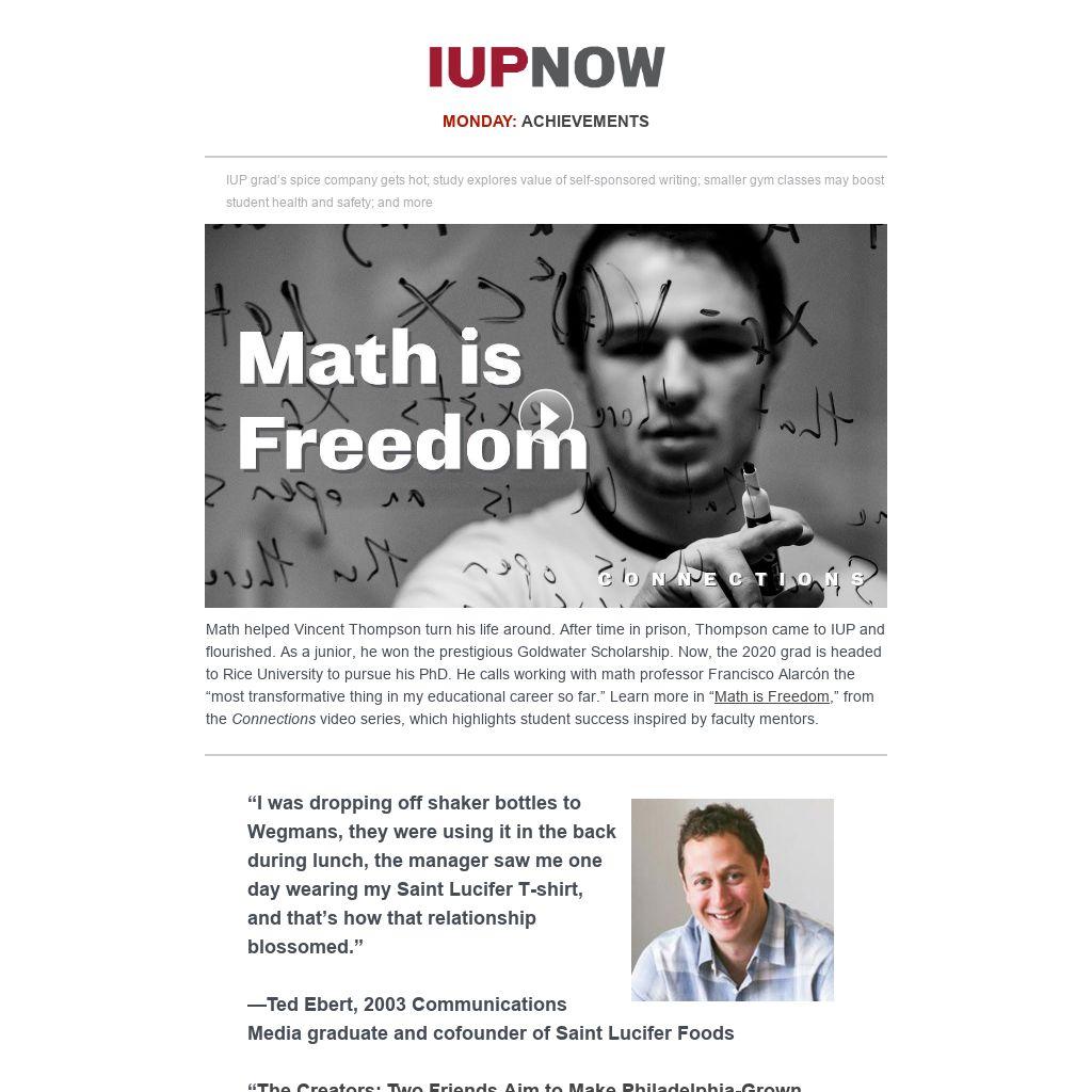 Math helped Vincent Thompson turn his life around. After time in prison, Thompson came to IUP and flourished. As a junior, he won the prestigious Goldwater Scholarship. Now, the 2020 grad is headed to Rice University to pursue his PhD. He calls working with math professor Francisco Alarcón the “most transformative thing in my educational career so far.” Learn more in “Math is Freedom,” from the Connections video series, which highlights student success inspired by faculty mentors.