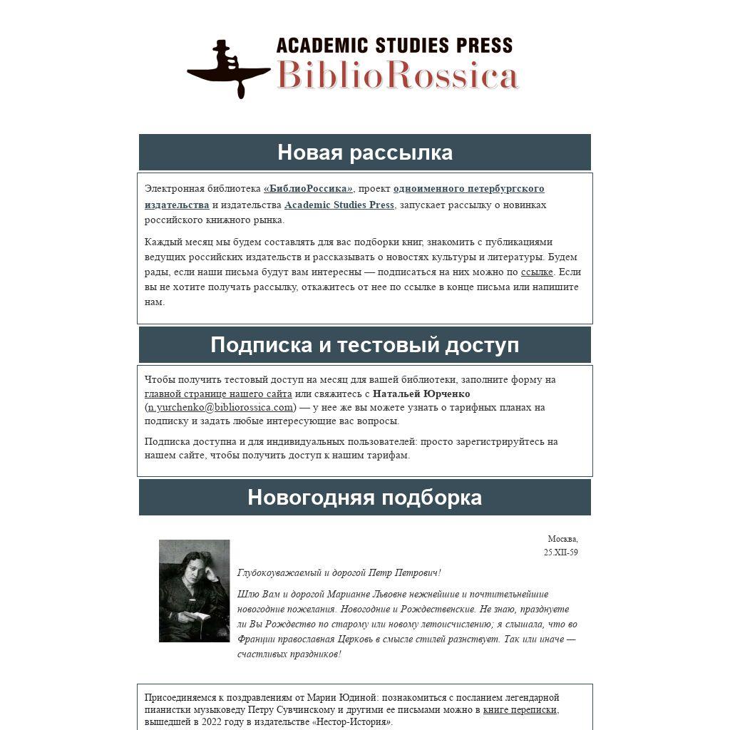 Шлю Вам и дорогой Марианне Львовне нежнейшие и почтительнейшие новогодние пожелания. Новогодние и Рождественские. Не знаю, празднуете ли Вы Рождество по старому или новому летоисчислению; я слышала, что во Франции православная Церковь в смысле стилей разнствует. Так или иначе — счастливых праздников!