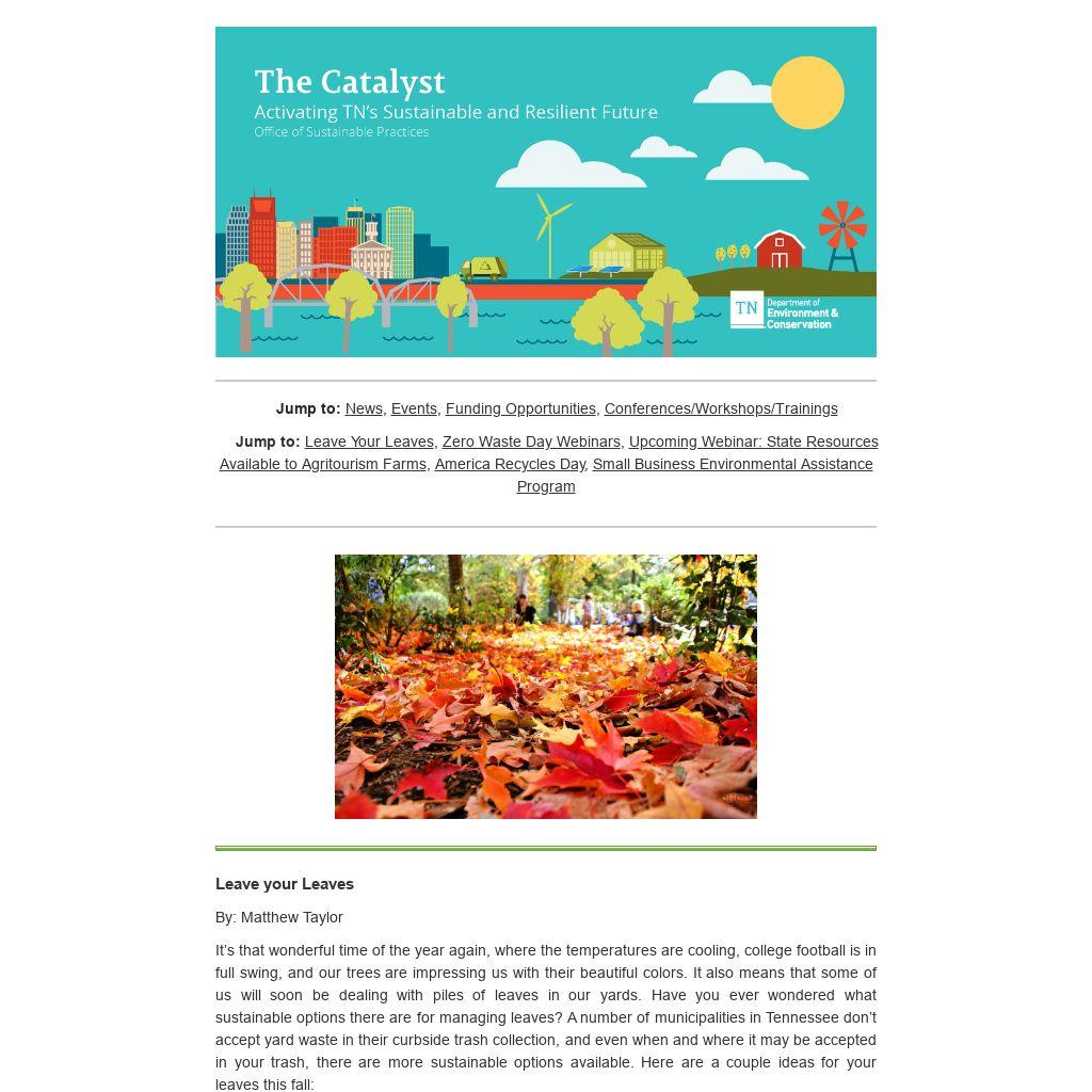 It’s that wonderful time of the year again, where the temperatures are cooling, college football is in full swing, and our trees are impressing us with their beautiful colors. It also means that some of us will soon be dealing with piles of leaves in our yards. Have you ever wondered what sustainable options there are for managing leaves? A number of municipalities in Tennessee don’t accept yard waste in their curbside trash collection, and even when and where it may be accepted in your trash, there are more sustainable options available. Here are a couple ideas for your leaves this fall: