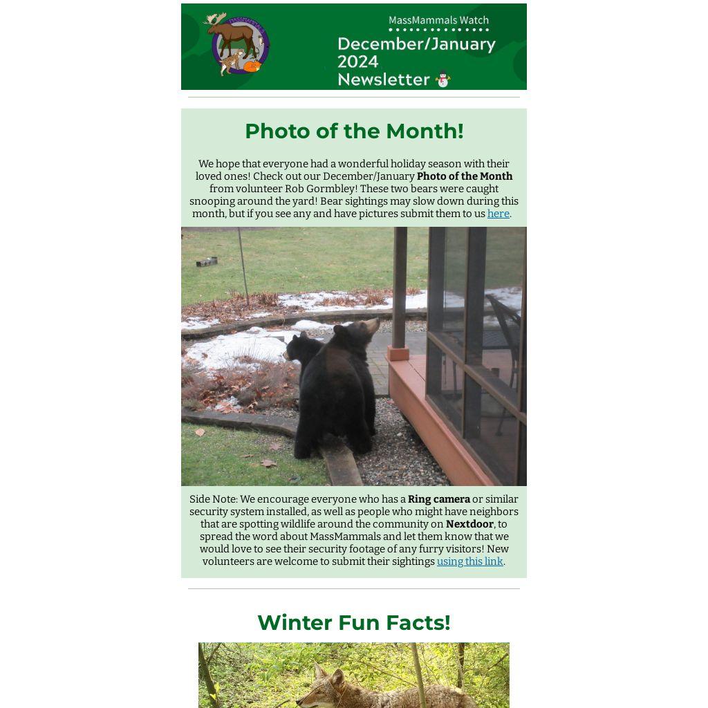 We hope that everyone had a wonderful holiday season with their loved ones! Check out our December/January Photo of the Month from volunteer Rob Gormbley! These two bears were caught snooping around the yard! Bear sightings may slow down during this month, but if you see any and have pictures submit them to us here.
