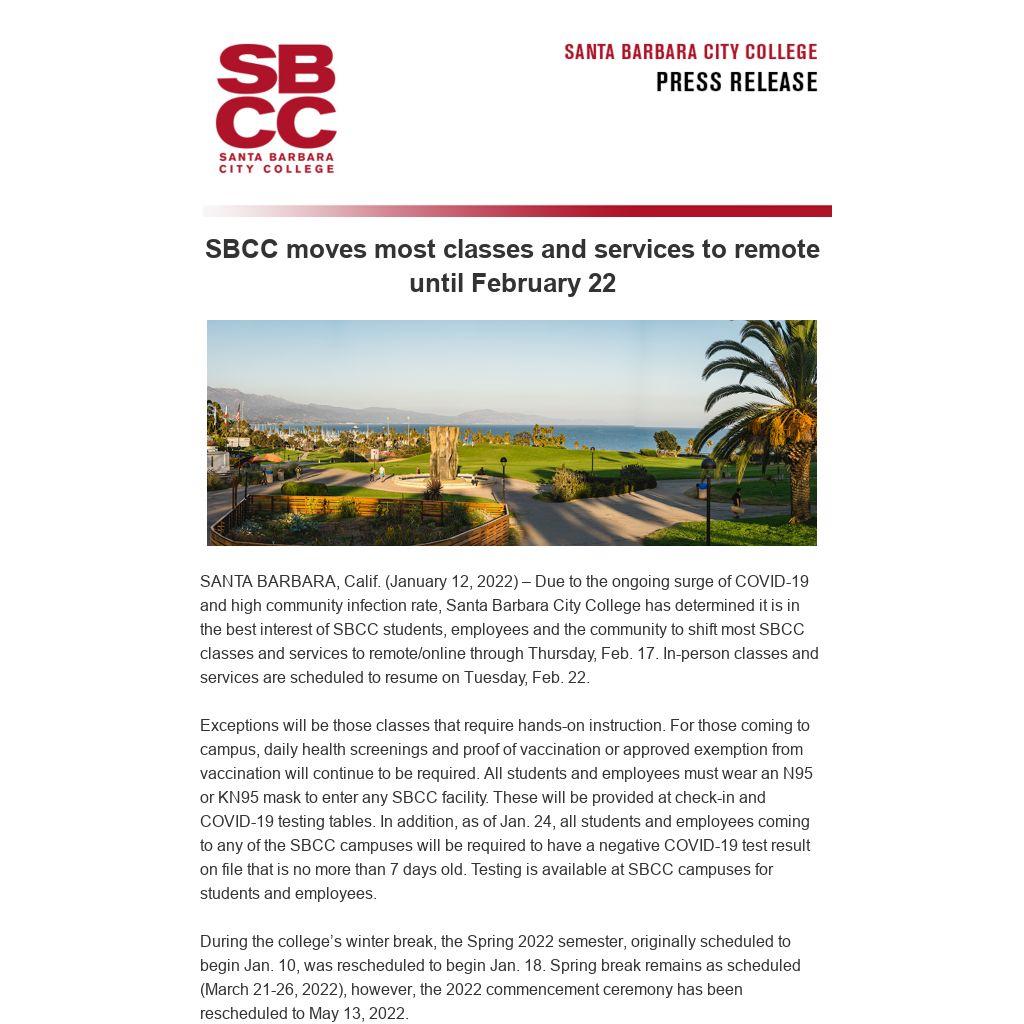 SANTA BARBARA, Calif. (January 12, 2022) – Due to the ongoing surge of COVID-19 and high community infection rate, Santa Barbara City College has determined it is in the best interest of SBCC students, employees and the community to shift most SBCC classes and services to remote/online through Thursday, Feb. 17. In-person classes and services are scheduled to resume on Tuesday, Feb. 22.
