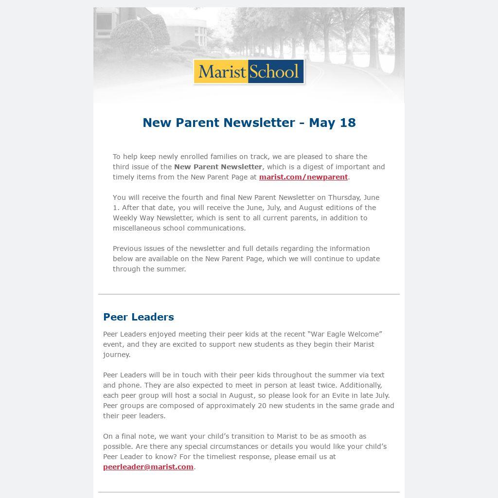 To help keep newly enrolled families on track, we are pleased to share the third issue of the New Parent Newsletter, which is a digest of important and timely items from the New Parent Page at marist.com/newparent.