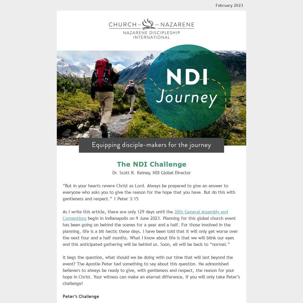 I would like for you to consider taking what we will be calling “the NDI challenge.” The NDI challenge will begin as you visit the Local Church Ministries exhibit in Indianapolis, Indiana, staring 9 June. One portion of this exhibit is dedicated to Nazarene Discipleship International (NDI). At the NDI exhibit, you will be invited to take the NDI challenge.