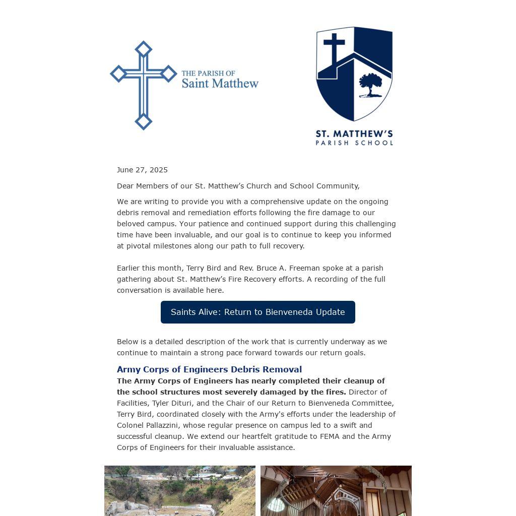 We are encouraged by the quality of professionals now working to restore our sacred spaces and educational facilities, and we thank you for your continued prayers, support, and understanding during this restoration period. We will continue to provide regular updates as this important work progresses. Please reach out with questions or concerns.