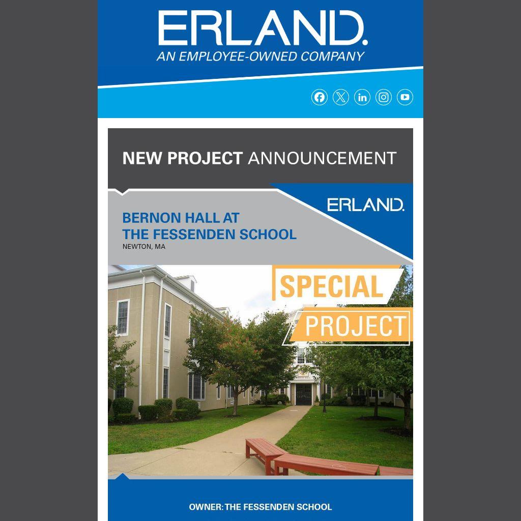 The Fessenden School has once again selected Erland, in collaboration with Imai Keller Moore, to refresh 8,000 square feet of Bernon Hall. The project includes upgrades to the lobby and corridor spaces with new lighting, carpeting, terrazzo flooring in the main lobby, millwork cubbies, and fresh paint. Scheduled as a fast-track summer renovation, the work will be completed in just 10 weeks—ensuring the space is ready before students return in the fall.