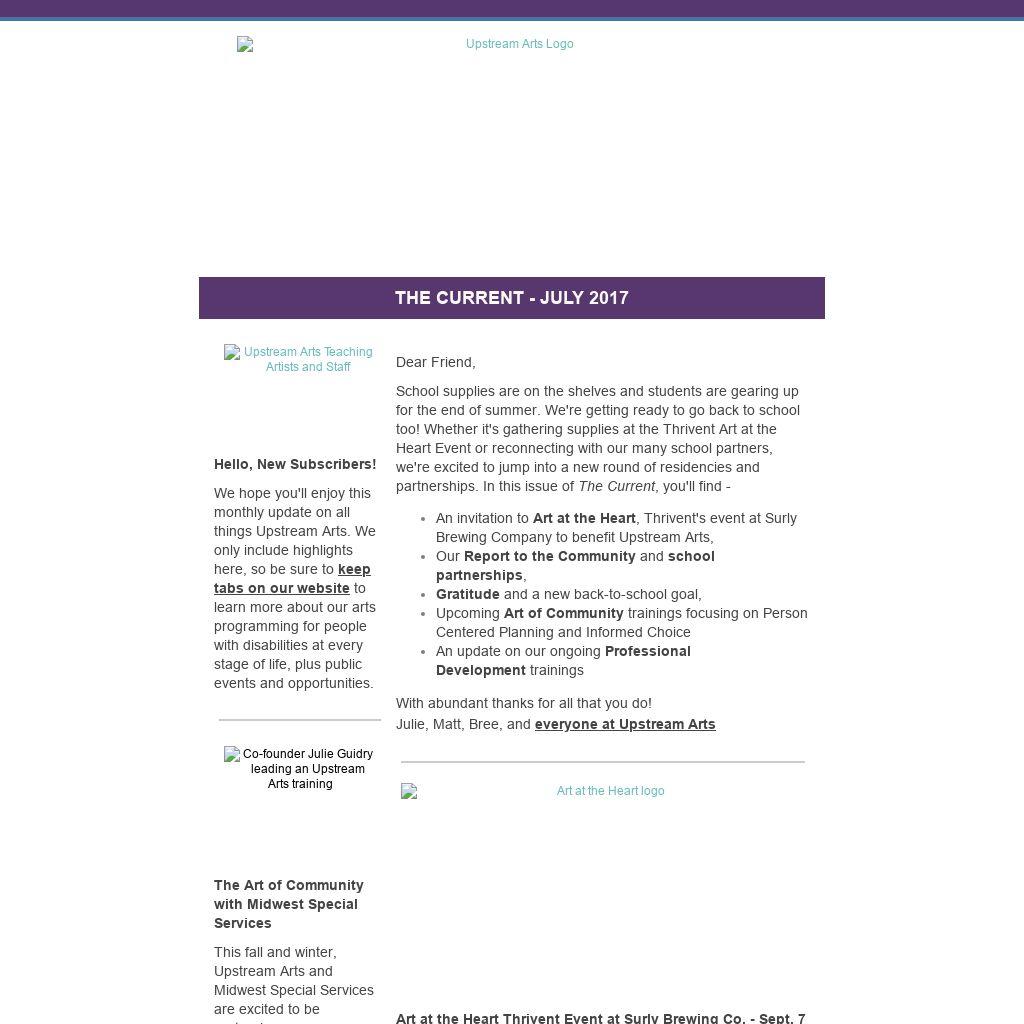 School supplies are on the shelves and students are gearing up for the end of summer. We're getting ready to go back to school too! Whether it's gathering supplies at the Thrivent Art at the Heart Event or reconnecting with our many school partners, we're excited to jump into a new round of residencies and partnerships. In this issue of The Current, you'll find -- An invitation to Art at the Heart, Thrivent's event at Surly Brewing Company to benefit Upstream Arts,