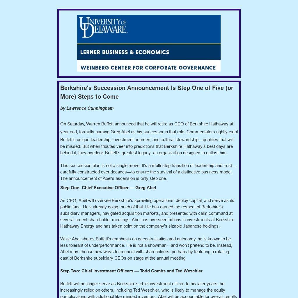 On Saturday, Warren Buffett announced that he will retire as CEO of Berkshire Hathaway at year end, formally naming Greg Abel as his successor in that role. Commentators rightly extol Buffett’s unique leadership, investment acumen, and cultural stewardship—qualities that will be missed. But when tributes veer into predictions that Berkshire Hathaway’s best days are behind it, they overlook Buffett’s greatest legacy: an organization designed to outlast him.