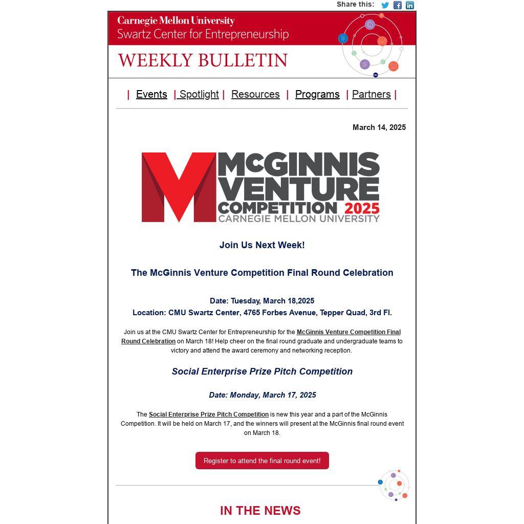 Join us at the CMU Swartz Center for Entrepreneurship for the McGinnis Venture Competition Final Round Celebration on March 18! Help cheer on the final round graduate and undergraduate teams to victory and attend the award ceremony and networking reception.