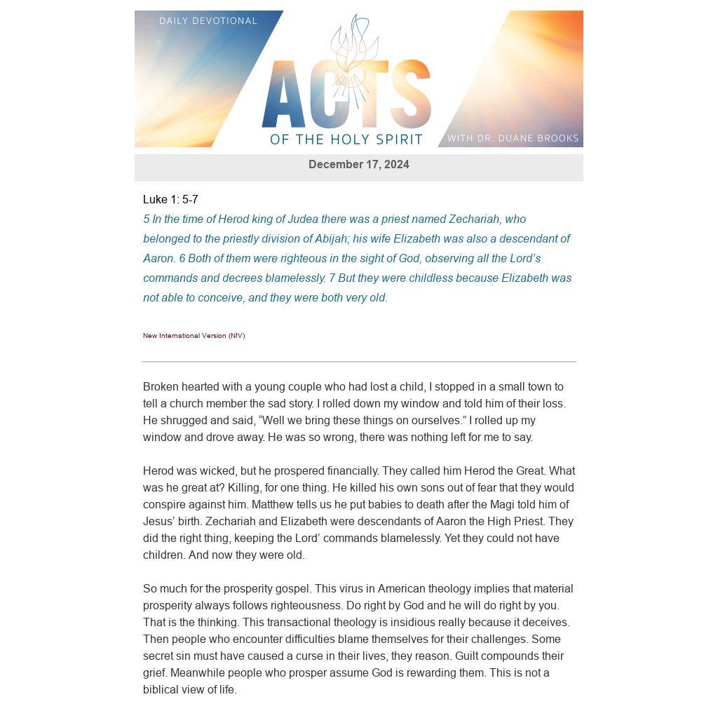 Some of the finest Christians I have ever known were not blessed with the ability to have children. Nor did they experience great material blessing. Meanwhile some of the worst people I know have the midas touch. Everything they do turns to gold. In this life, the scales do not always balance. But they will in eternity. God was about to do something greater than Zechariah and Elizabeth could have imagined. Herod’s reign ended with his death. But the baby God gave to Zechariah and Elizabeth would announce the eternal reign of Jesus, who is truly great.
