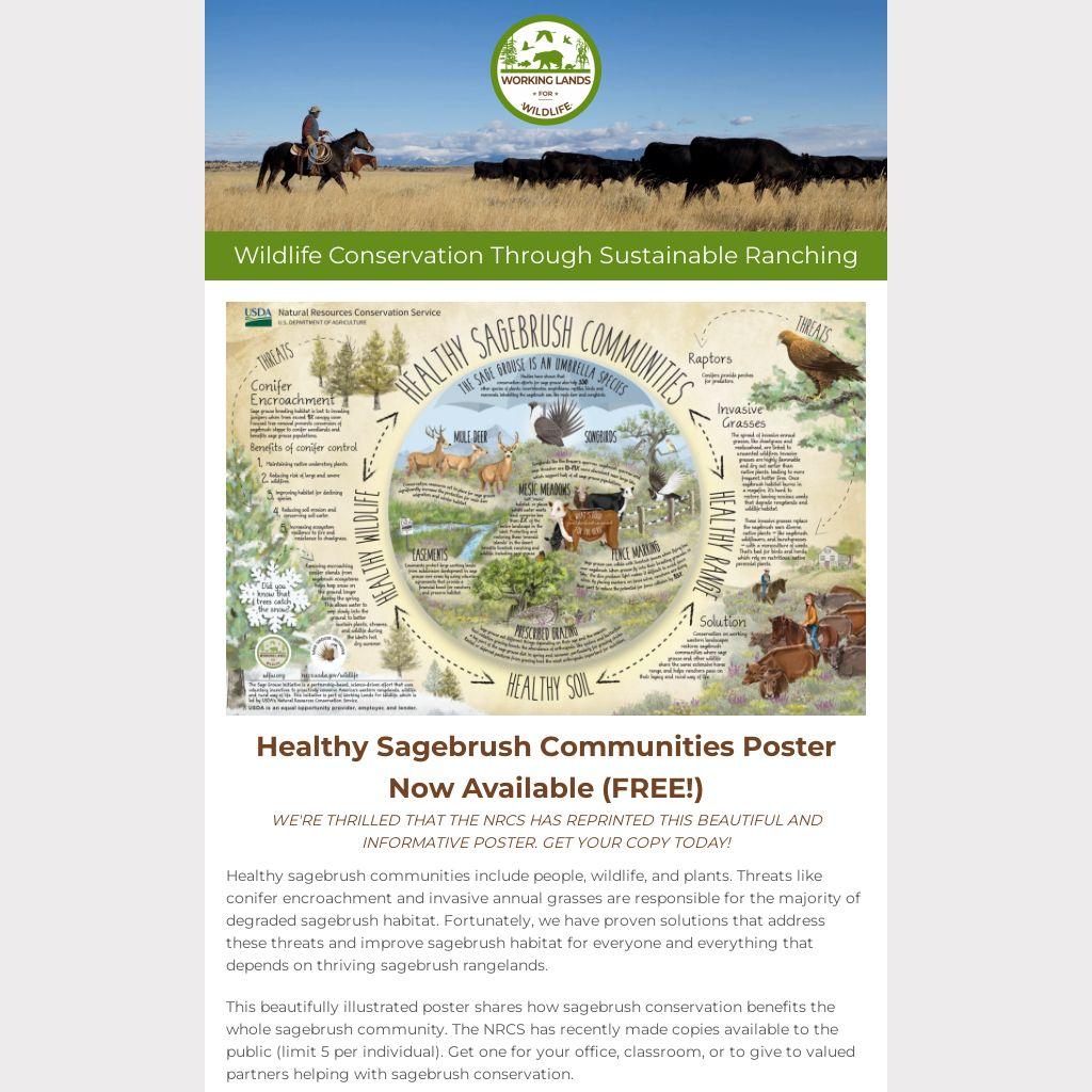 This beautifully illustrated poster shares how sagebrush conservation benefits the whole sagebrush community. The NRCS has recently made copies available to the public (limit 5 per individual). Get one for your office, classroom, or to give to valued partners helping with sagebrush conservation.